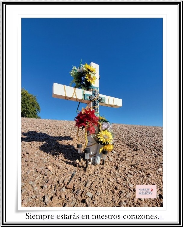 Roadside memorial shrine for Alejandro Arredondo with a stone cross, flowers, and Virgin Mary statue in the Arizona desert.